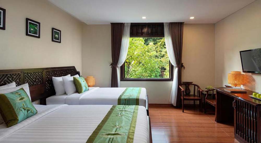 Phòng Classic Premium Family Garden View tại Tam Coc La Montagne Resort & Spa là hạng phòng được thiết kế riêng cho các gia đình mong muốn tận hưởng không gian nghỉ dưỡng thoải mái, tiện nghi và gần gũi thiên nhiên trong chuyến du lịch Ninh Bình. Với diện tích rộng rãi, bố cục hợp lý và nội thất thân thiện, phòng mang đến cảm giác ấm áp như chính ngôi nhà của bạn, nhưng lại được bao bọc bởi cảnh sắc núi non và vườn cây xanh mát đặc trưng vùng Tam Cốc.