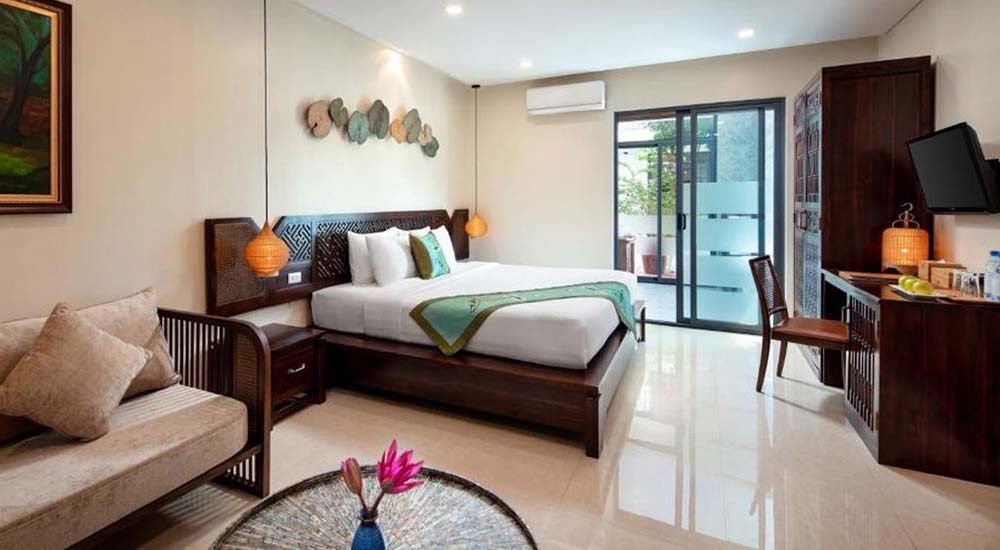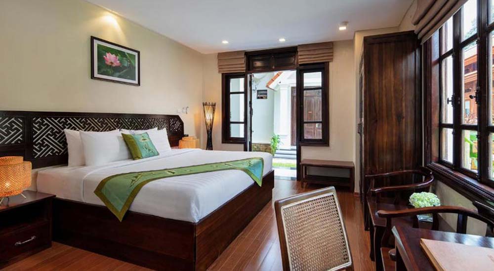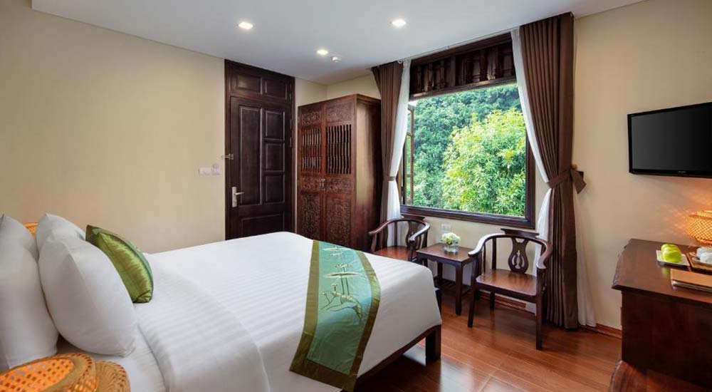 Phòng Classic Premium Garden View tại Tam Coc La Montagne Resort & Spa là lựa chọn lý tưởng cho những ai yêu thích không gian nghỉ dưỡng nhẹ nhàng, chan hòa cùng thiên nhiên. Sở hữu thiết kế mang đậm phong cách Đông Dương kết hợp nét hiện đại, hạng phòng này gây ấn tượng bởi sự chỉn chu trong từng chi tiết nội thất – từ tông màu gỗ ấm áp, ánh đèn dịu nhẹ cho đến những khung cửa sổ lớn mở ra khu vườn xanh mướt.