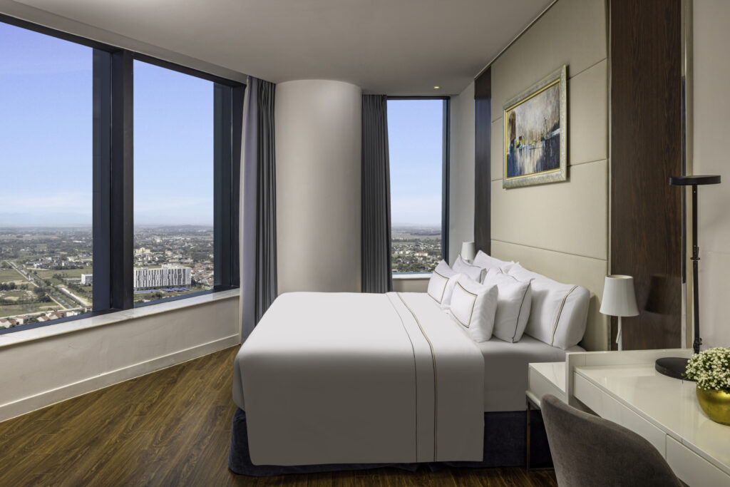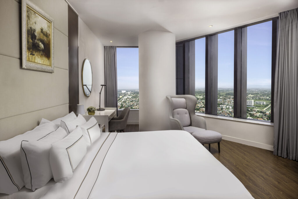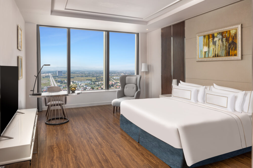 Premium Corner Giường Đôi tại Vinpearl Hà Tĩnh là hạng phòng được yêu thích nhờ vị trí góc độc đáo và không gian ngập tràn ánh sáng tự nhiên. Với thiết kế hai mặt thoáng hướng ra thành phố hoặc thiên nhiên xung quanh, căn phòng mang đến trải nghiệm hoàn toàn khác biệt – vừa riêng tư, yên tĩnh, vừa đẳng cấp, thư thái đúng chuẩn nghỉ dưỡng 5 sao.