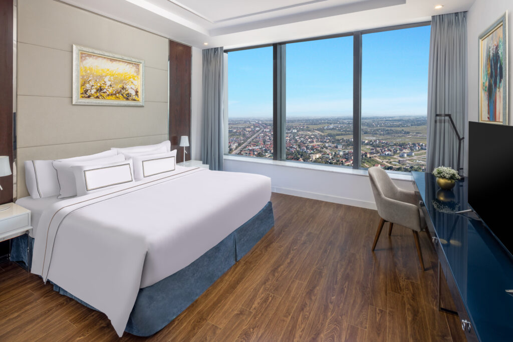 Executive Suite Vinpearl Hà Tĩnh là hạng phòng cao cấp được thiết kế riêng dành cho giới doanh nhân, khách công tác hoặc những ai đang tìm kiếm một không gian lưu trú rộng rãi, sang trọng và yên tĩnh giữa lòng thành phố. Với diện tích lớn hơn hẳn các hạng phòng thông thường, căn phòng mang đến cảm giác như một “căn hộ thu nhỏ” – nơi bạn vừa có thể làm việc hiệu quả, vừa tận hưởng trọn vẹn phút giây nghỉ ngơi sau một ngày bận rộn.