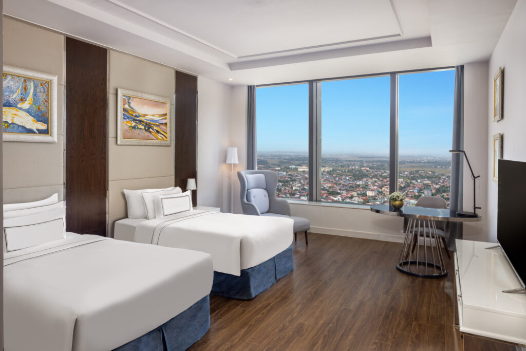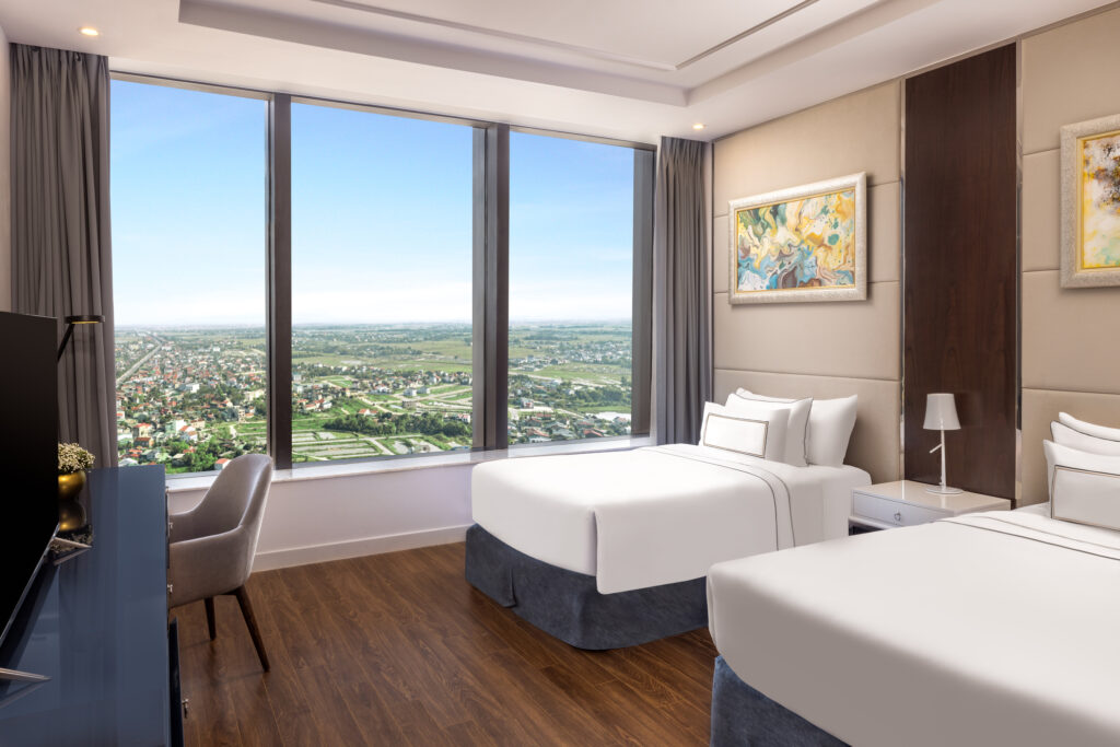 Deluxe 2 Giường Đơn Vinpearl Hà Tĩnh là hạng phòng được nhiều du khách ưa chuộng nhờ thiết kế hiện đại, không gian rộng rãi và mức giá hợp lý so với mặt bằng khách sạn 5 sao trong khu vực. Với diện tích khoảng 30m², phòng được bố trí hai giường đơn thoải mái, rất phù hợp cho nhóm bạn, đồng nghiệp đi công tác hoặc gia đình nhỏ có trẻ em.